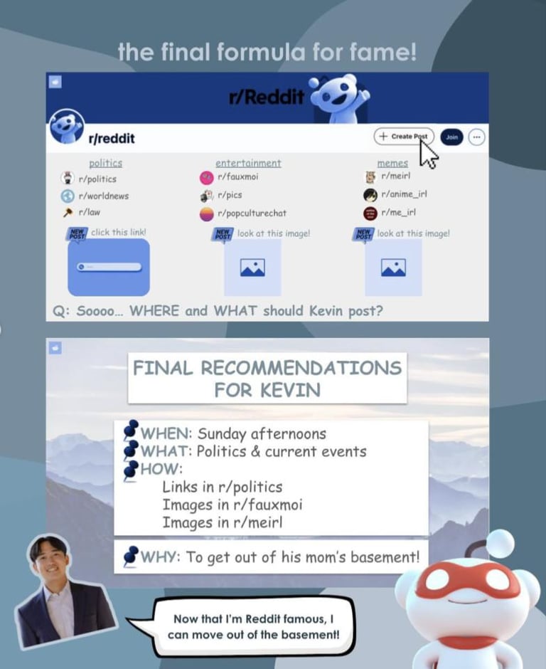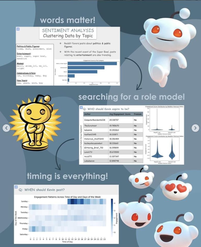 In 2025, teams analyzed a scraped dataset from the Reddit homepage to uncover the secrets of achieving "Reddit fame." Participants explored patterns in upvotes, engagement metrics, posting times, and content characteristics to determine what makes posts go viral. Teams presented creative insights ranging from optimal posting strategies to content themes that resonate with Reddit's audience.